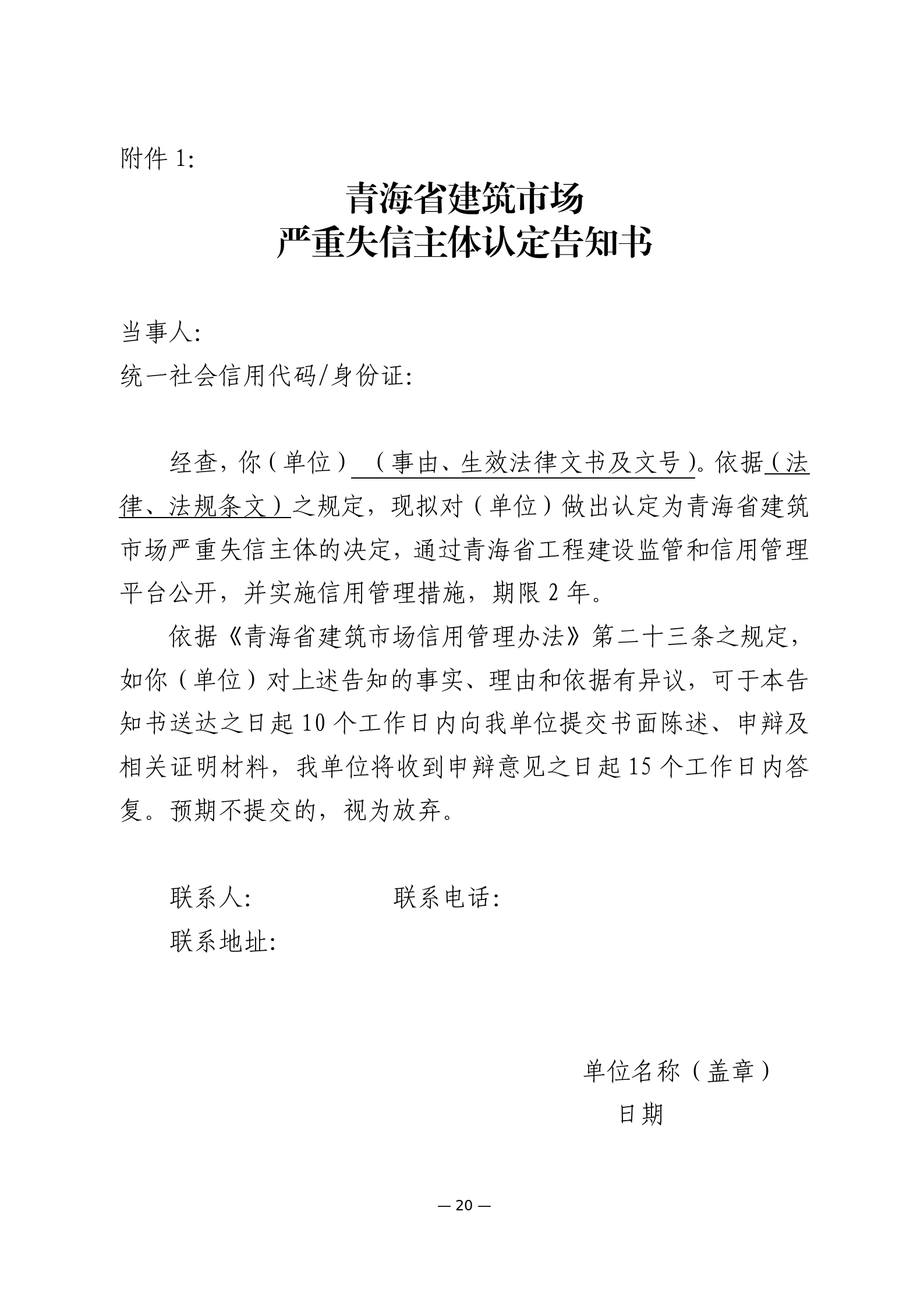 (一)經(jīng)發(fā)現(xiàn)存在建筑市場嚴重失信主體認定標準的,應(yīng)當向建筑市場主體送達《青海省建筑市場嚴重失信主體認定告知書》(附件1),告知書載明認定的理由、依據(jù)、懲戒措施和建筑市場主體享有的陳述、申辯權(quán)利。