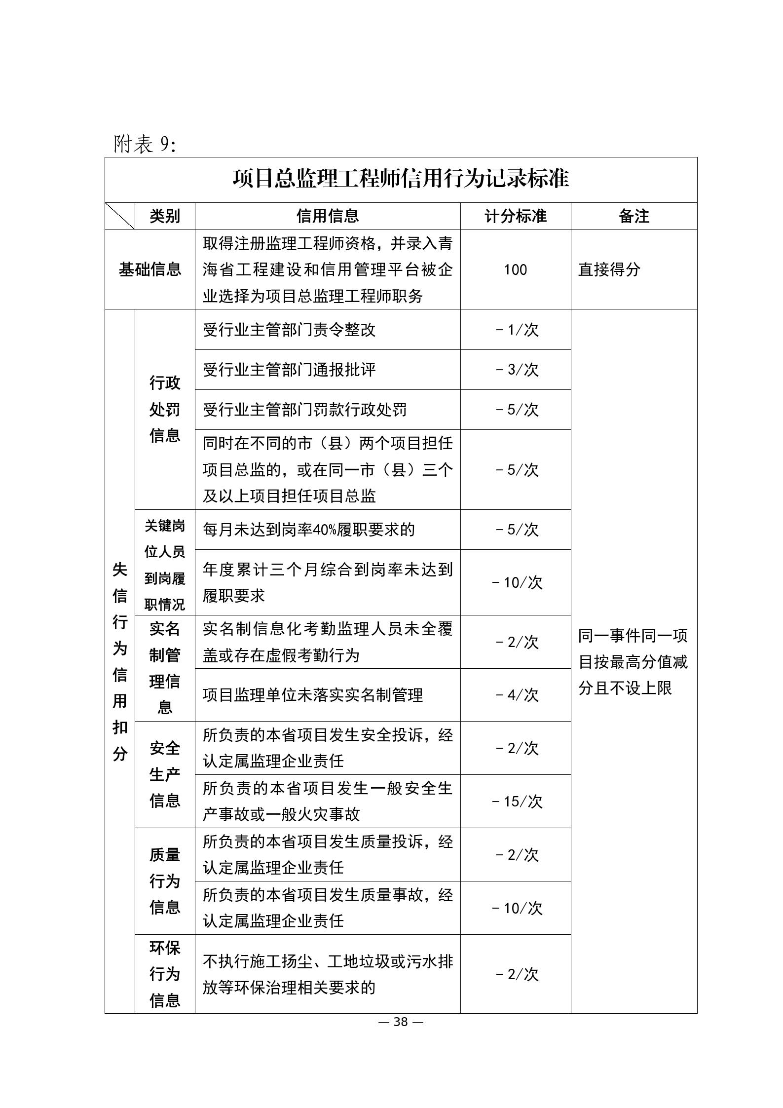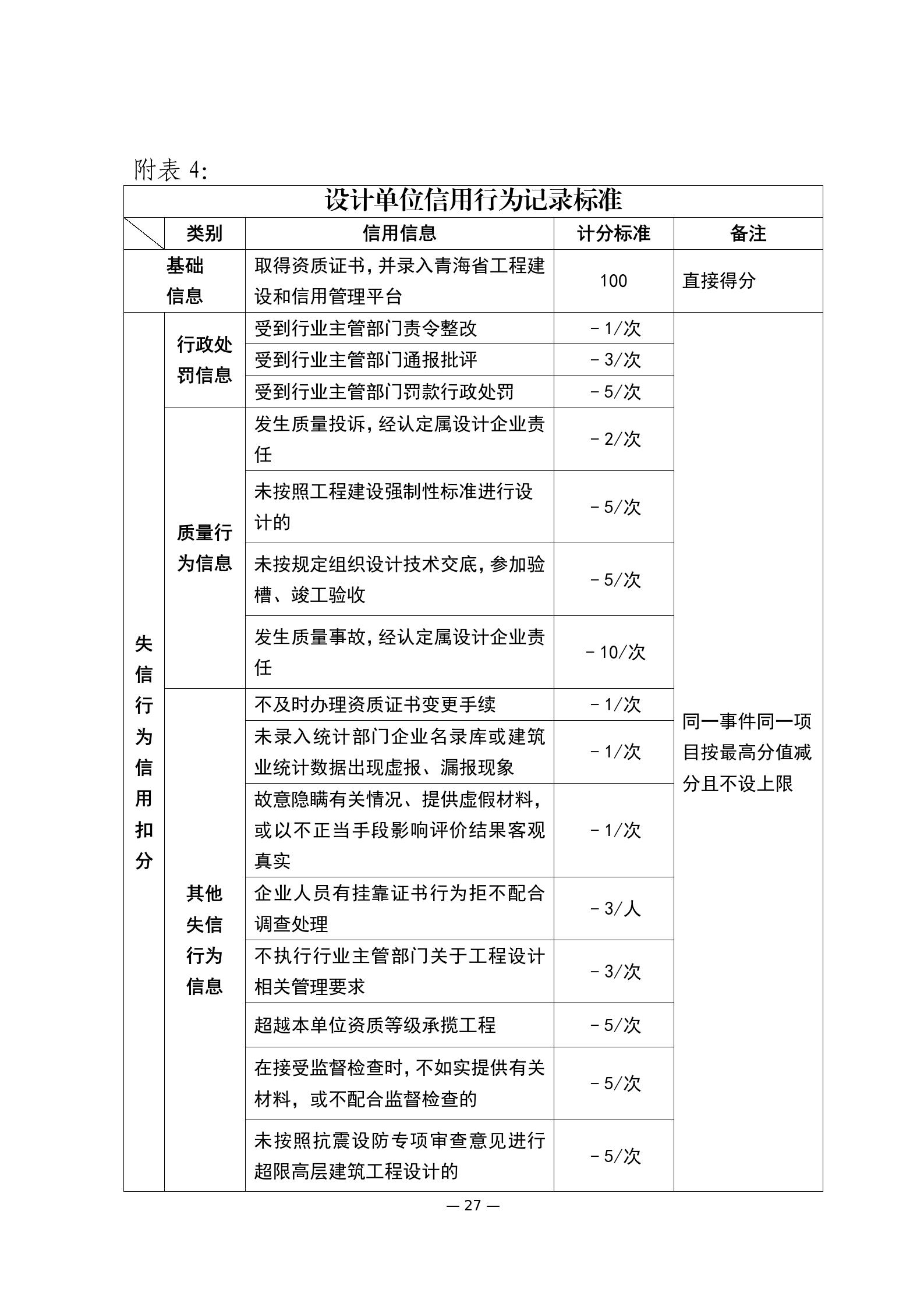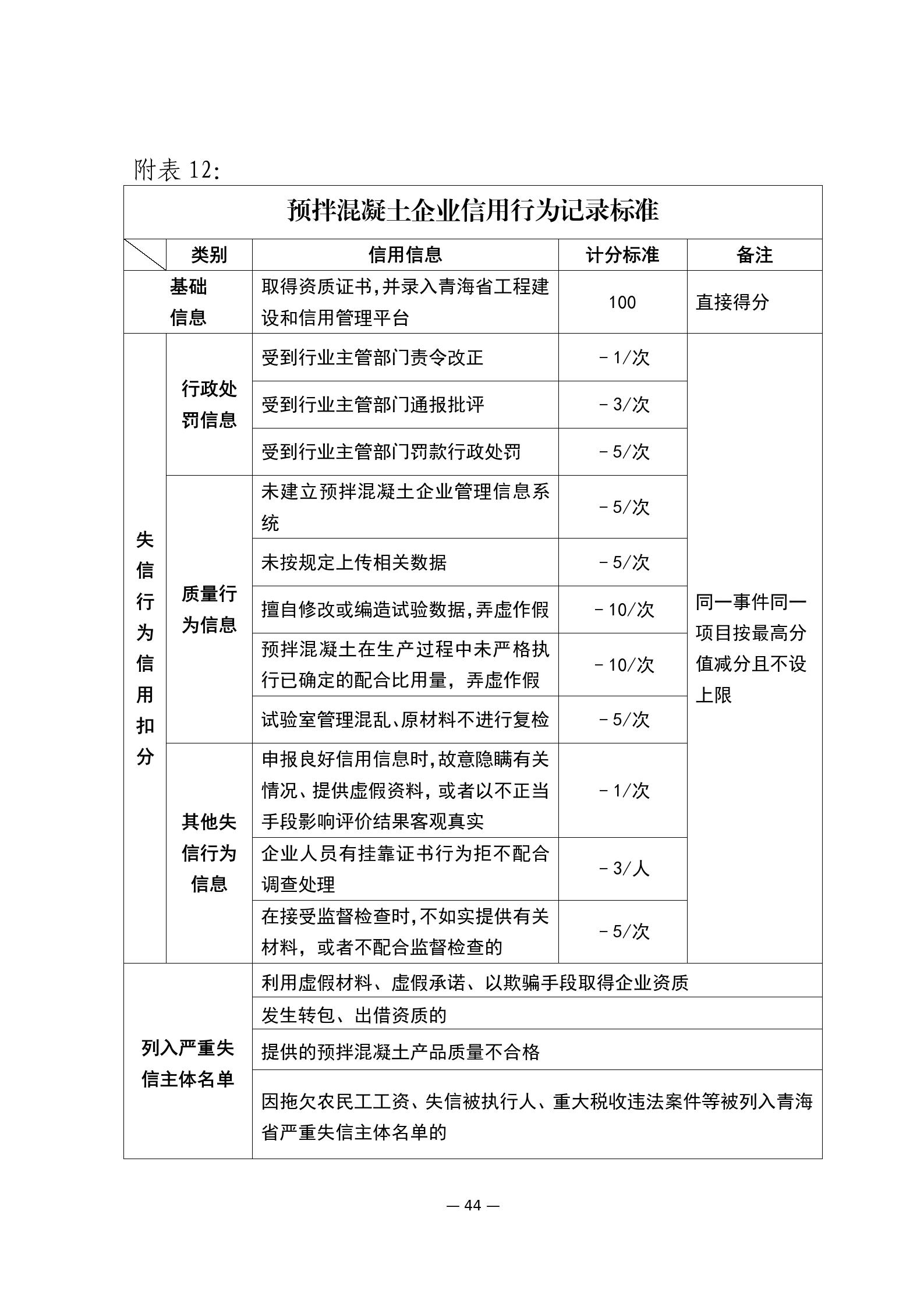 第十六條 建筑市場各方主體和從業(yè)人員的信用評價實行信用記錄、守信獎勵和失信行為動態(tài)記錄記分制。根據(jù)《青海省建筑市場各方主體和從業(yè)人員失信行為記分標準》(附件)進行公開展示和記分。基礎(chǔ)分100分。