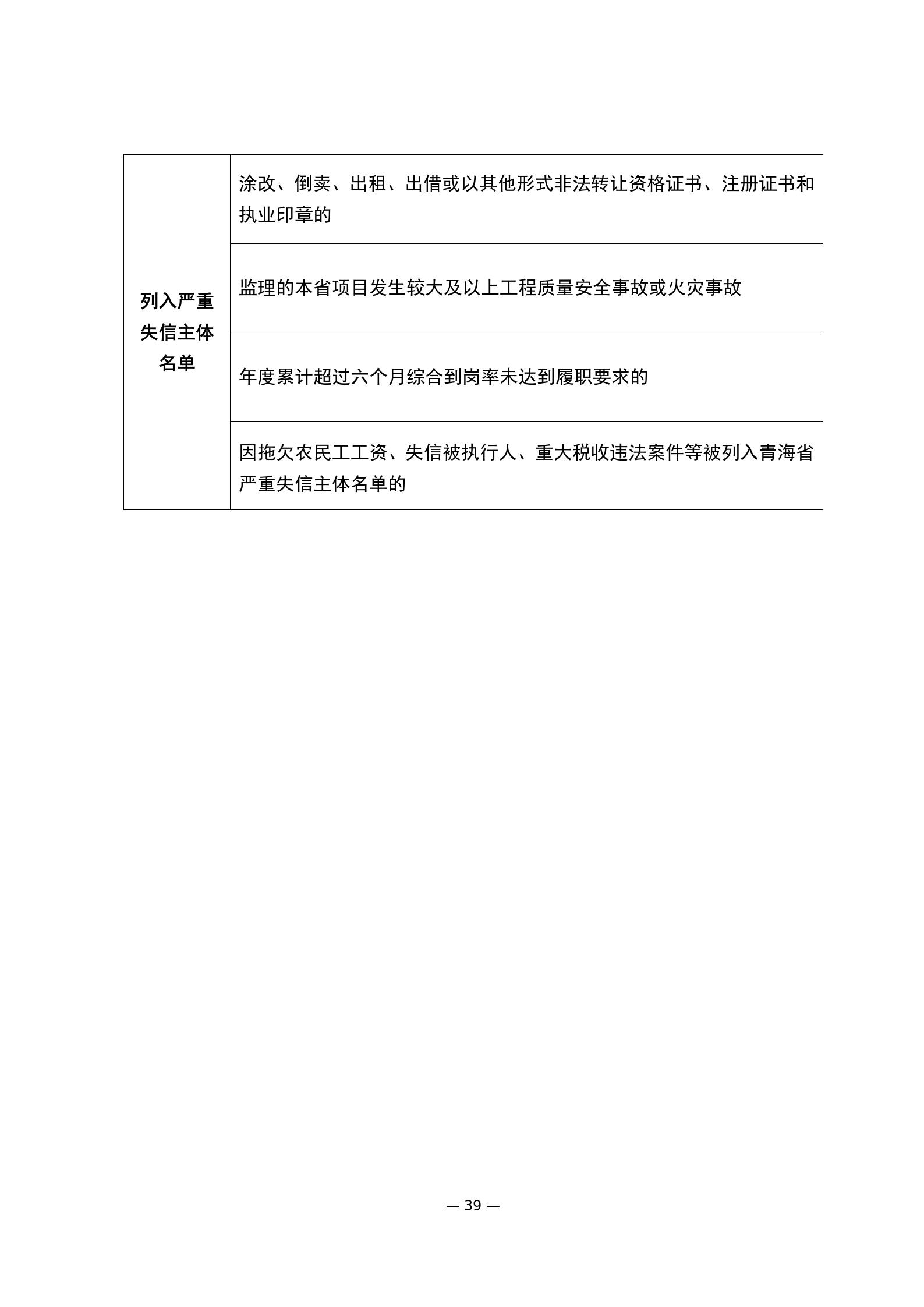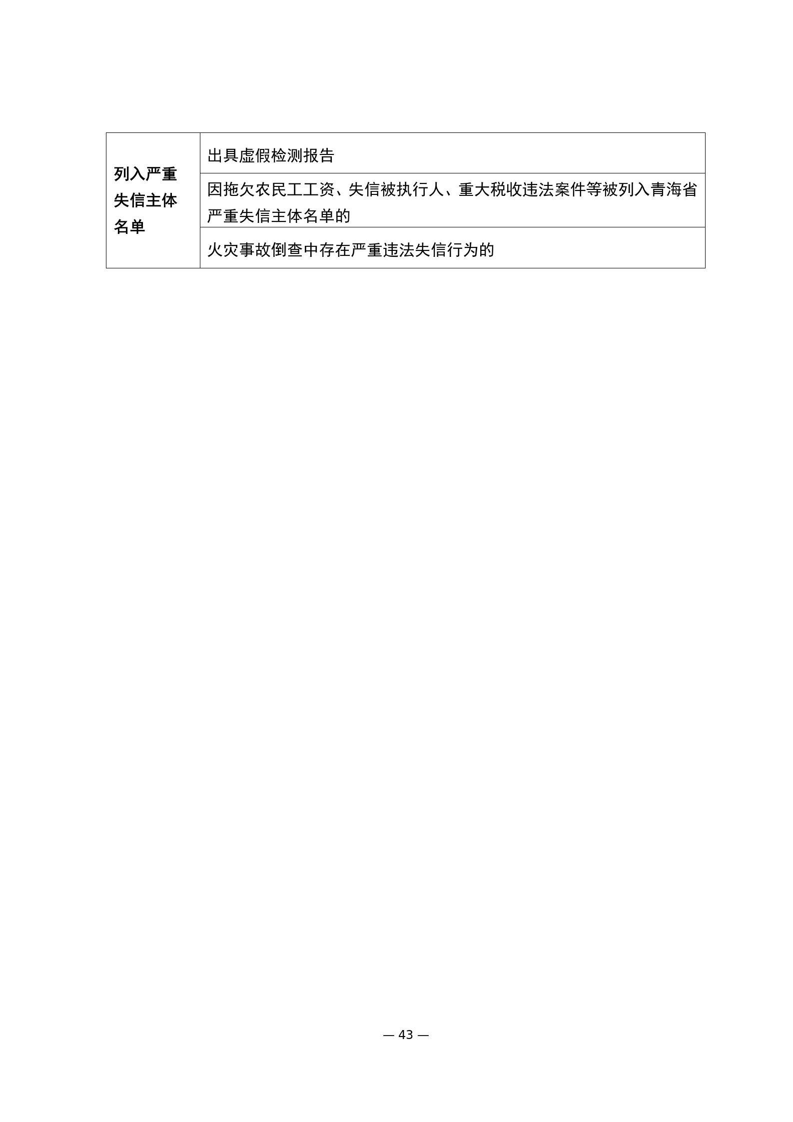 (一)在非國有投資項目中,建設(shè)單位不應(yīng)選用建筑市場主體嚴重失信主體名單的企業(yè)和從業(yè)人員參與工程建設(shè)活動;24個月內(nèi)取消其參與政府投資項目工程建設(shè)活動資格;省外進青企業(yè)24個月內(nèi)不受理進青登記業(yè)務(wù);