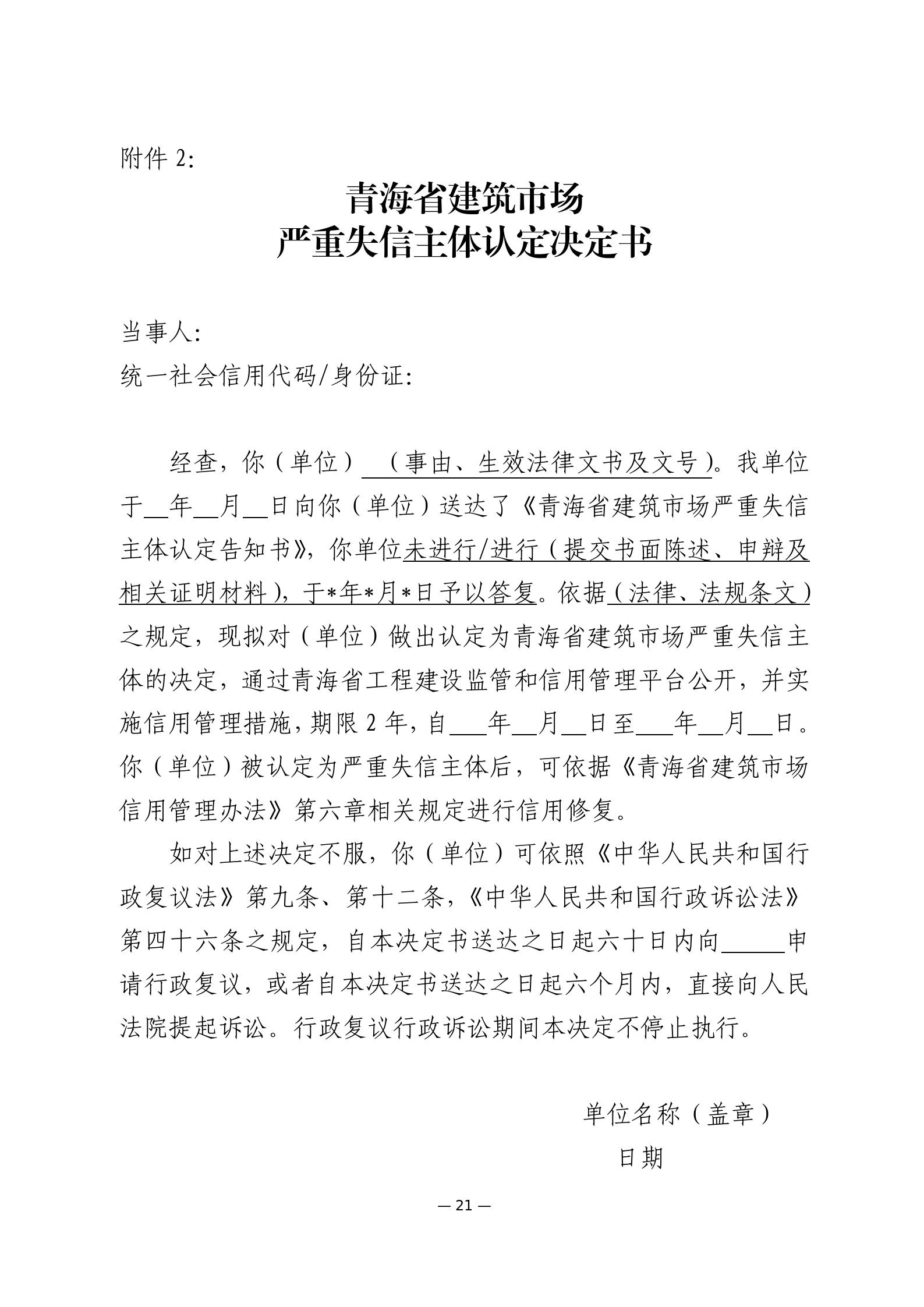 (四)住房和城鄉(xiāng)建設主管部門應當在決定作出后10個工作日內(nèi)向當事人送達《青海省建筑市場嚴重失信主體認定決定書》(附件2)。