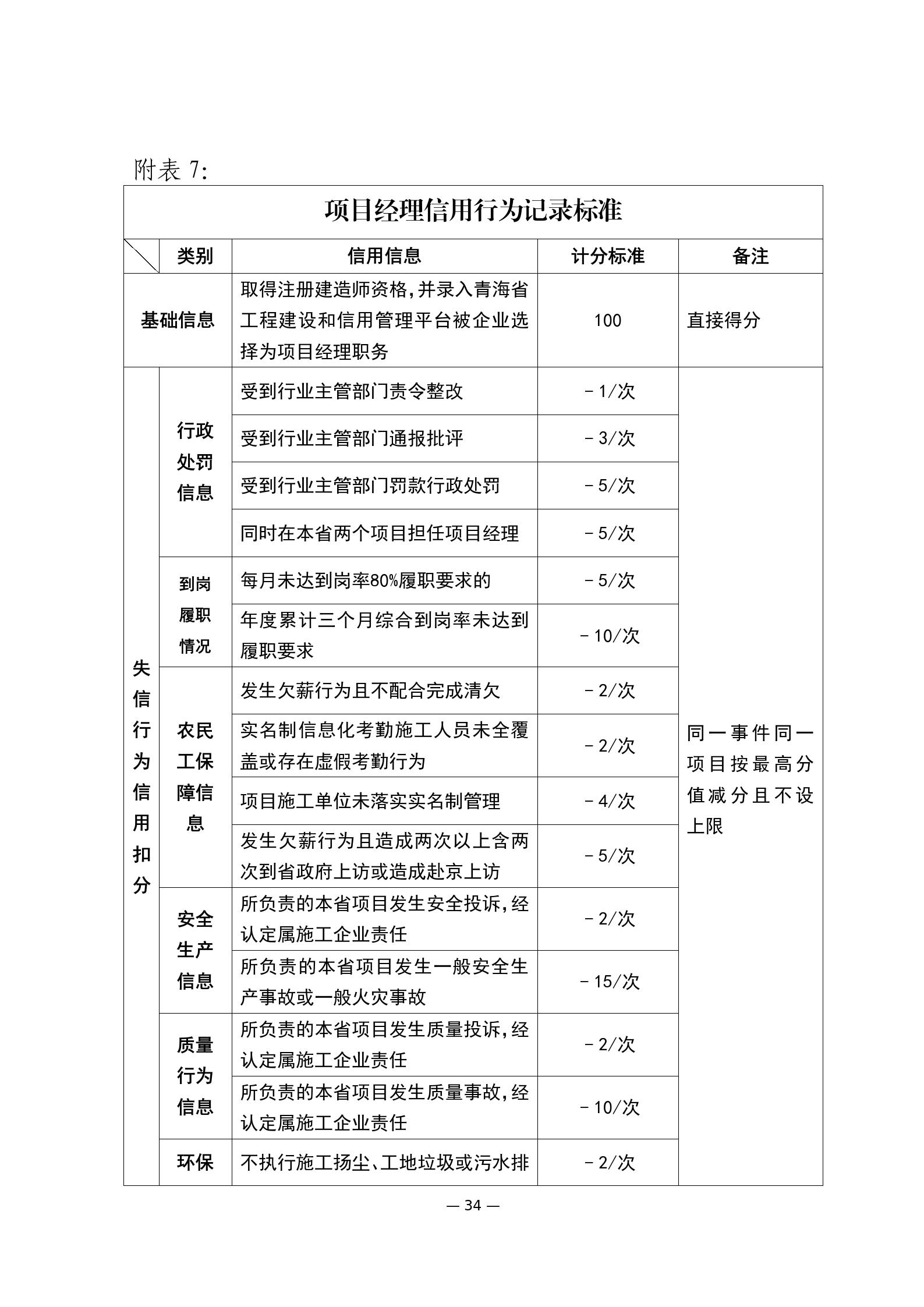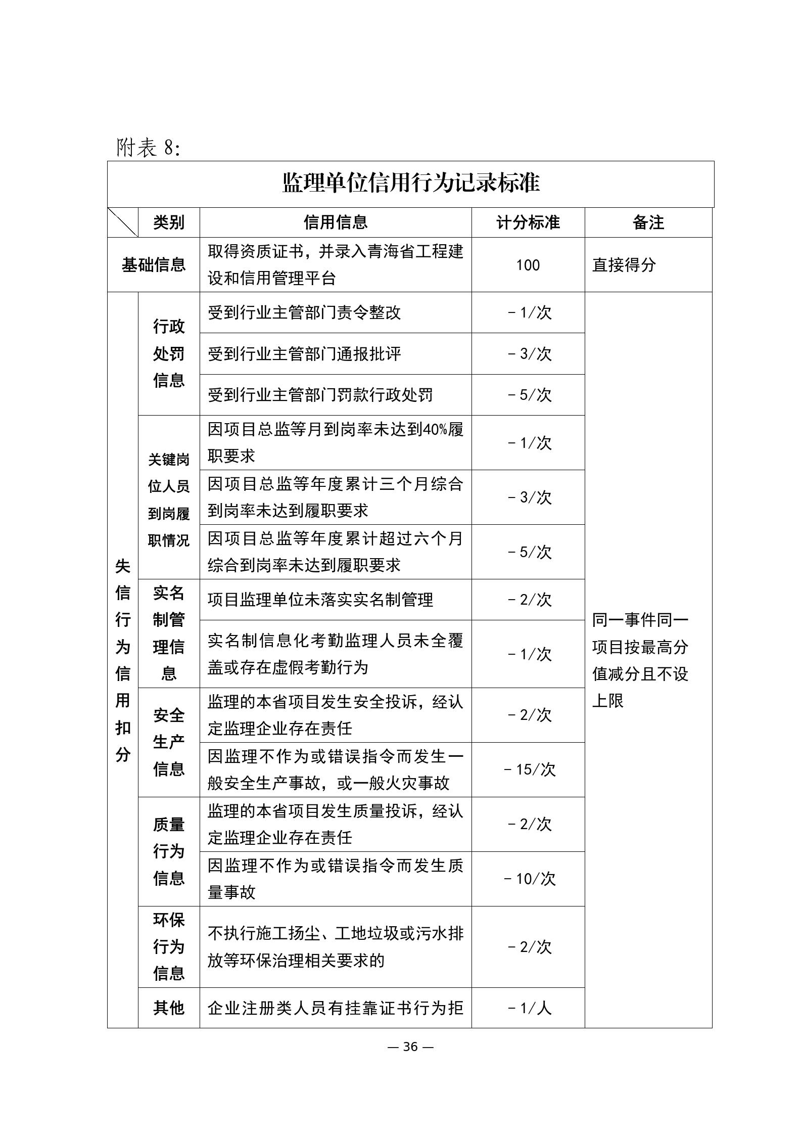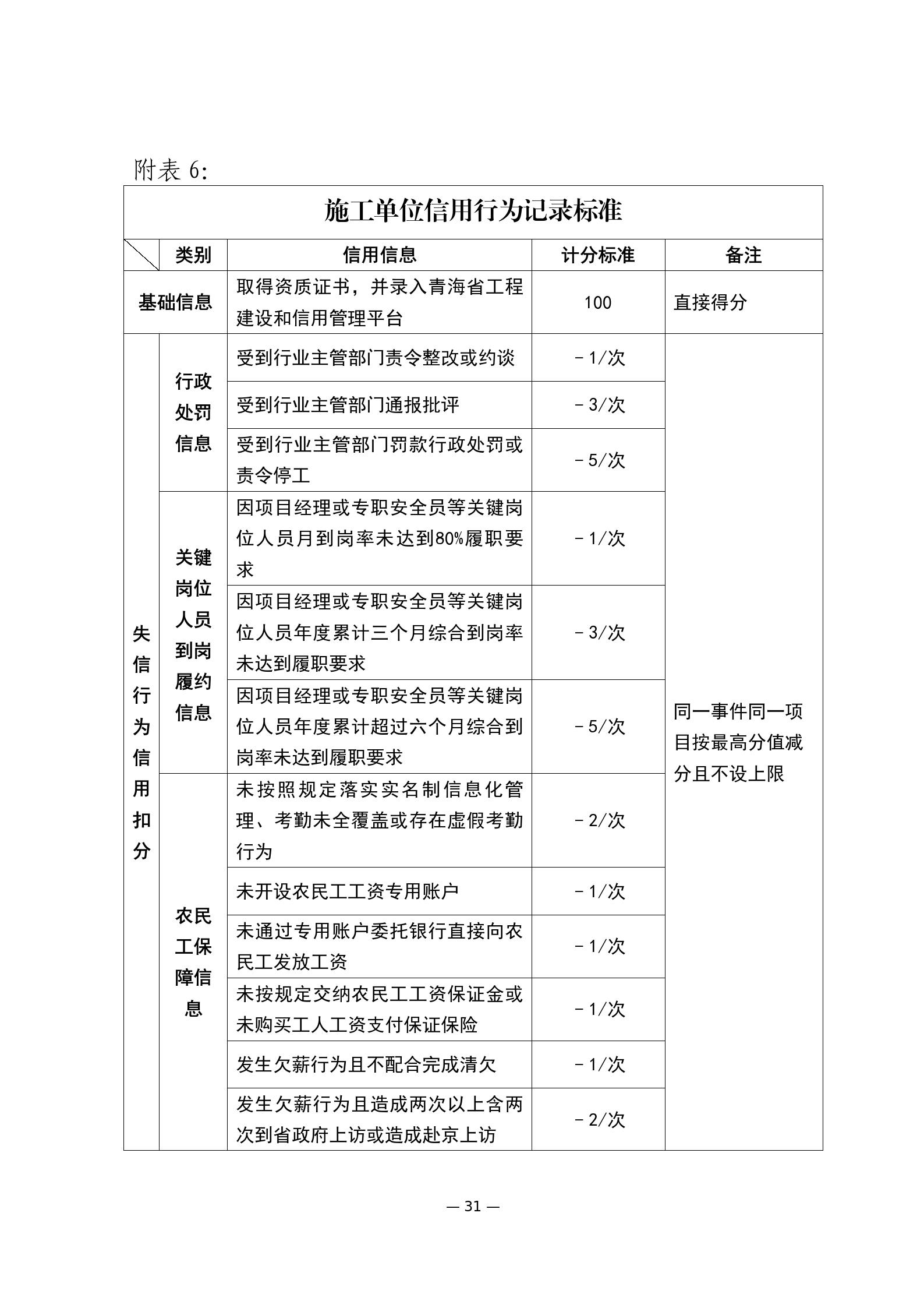 第十六條 建筑市場各方主體和從業(yè)人員的信用評價實行信用記錄、守信獎勵和失信行為動態(tài)記錄記分制。根據(jù)《青海省建筑市場各方主體和從業(yè)人員失信行為記分標準》(附件)進行公開展示和記分?;A(chǔ)分100分。