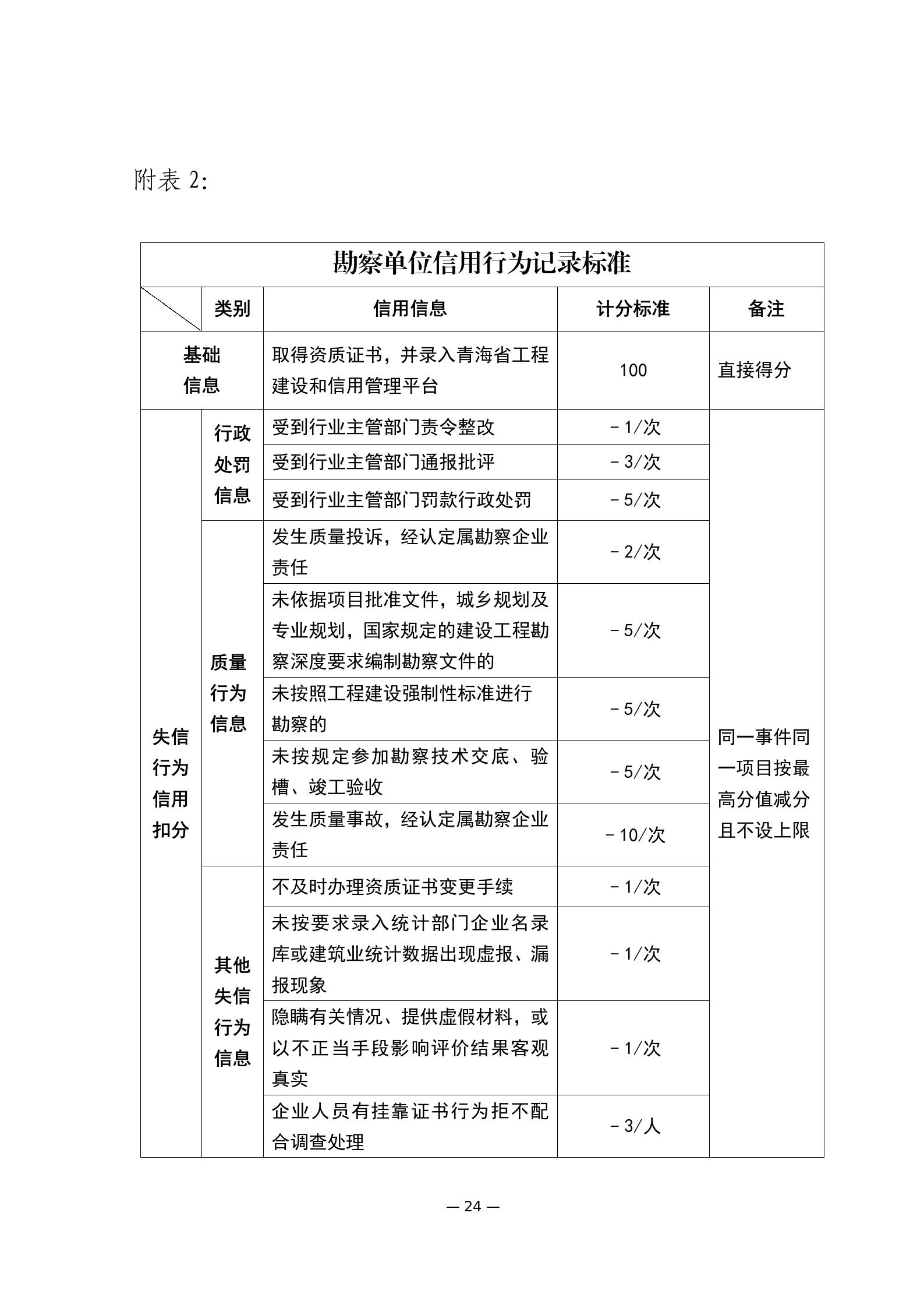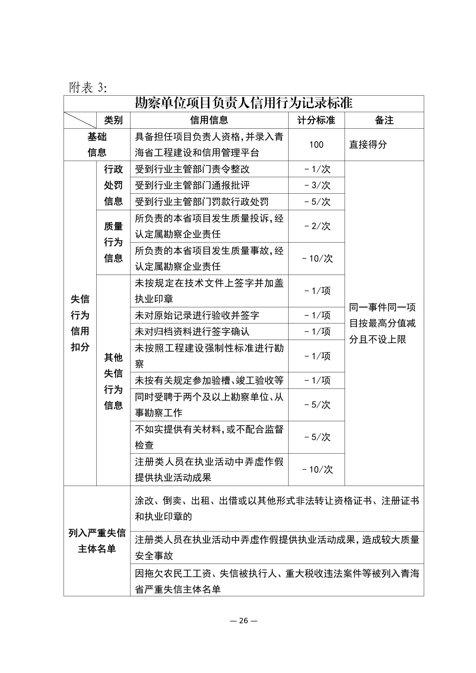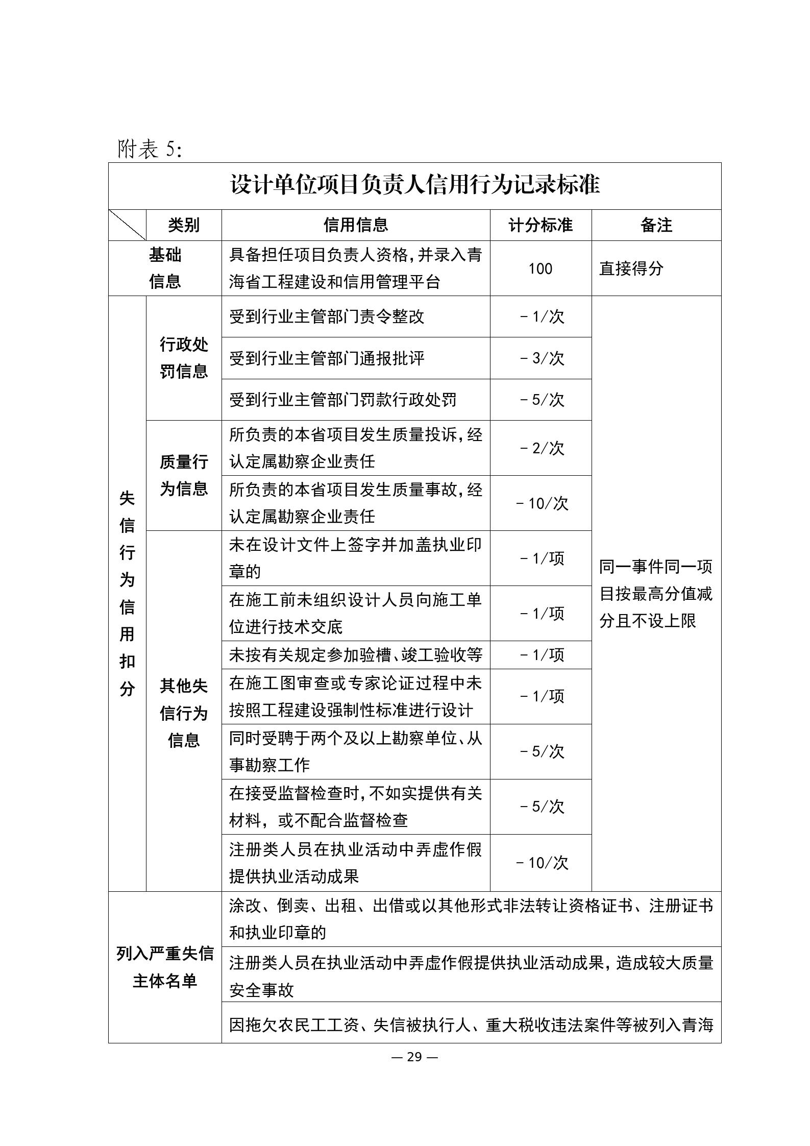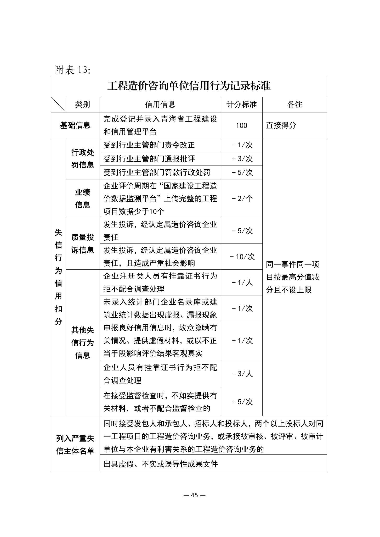 第十六條 建筑市場各方主體和從業(yè)人員的信用評價實行信用記錄、守信獎勵和失信行為動態(tài)記錄記分制。根據(jù)《青海省建筑市場各方主體和從業(yè)人員失信行為記分標準》(附件)進行公開展示和記分?;A(chǔ)分100分。